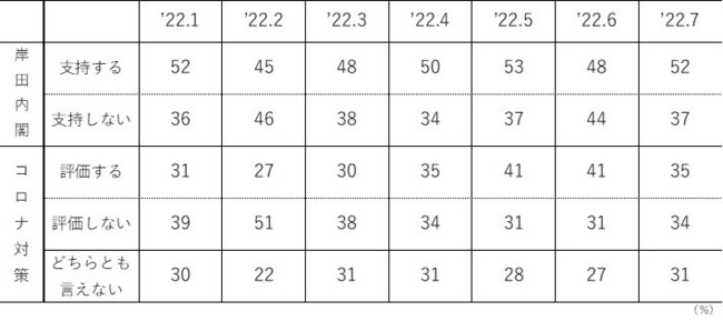 【表1】は、岸田内閣の支持・不支持と政権の新型コロナ対策評価について、推移をまとめたものです。7月に入り新型コロナウィルスへの感染が急拡大し、新規感染者数が連日10万人を超える中で、岸田政権のコロナ対策を「評価する」比率は35%に低下し、「評価しない」の34%と拮抗しました。ただ、コロナ対策評価と内閣評価との間に連動関係は見受けられません。