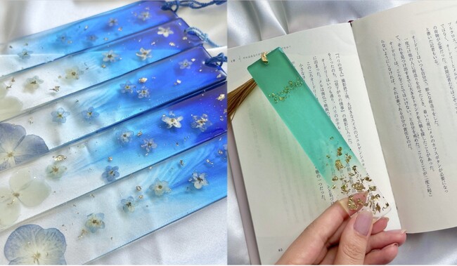 レジン作家による、一点一点丁寧に作られたハンドメイド作品です。本を傷つけないよう角を丸く、滑らかに加工しております。