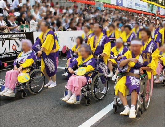 障害者の方および脳血管障害などで手足の不自由な方も、私たちといっしょに「阿波おどり」を楽しみましょうという趣旨や、目指す介護のあり方に共通の想いがあることから、株式会社リブドゥコーポレーションでは、2002年より社員のボランティア活動参加などを通じて支援を続けています。