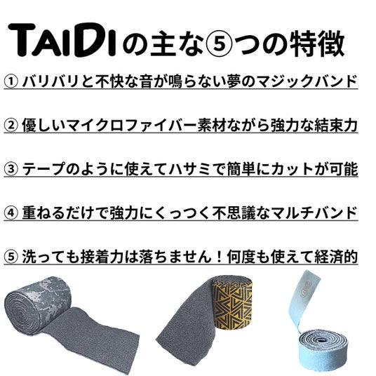 TAIDIは、国際特許ゼロファスナー採用 巻き付けるだけで簡単に固定できる便利なバンドです。マジックテープ特有の「ビリバリ音」を抑えつつ、肌にも優しい使い心地を実現しました。