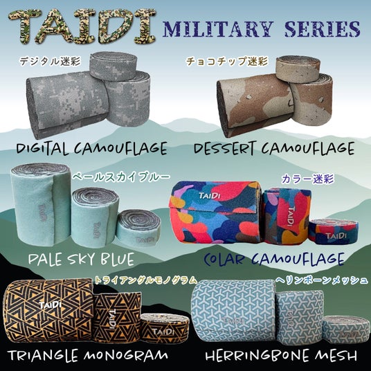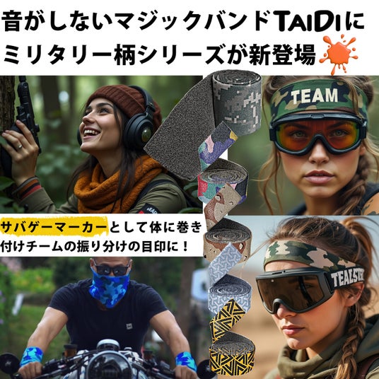 万能マルチバンドTAIDIの3点SET(S/M/Lサイズが各1点ずつ)CoSTORY割: 通常価格5,800円が30%OFFの4,060円(先着100セット限定)柄バリエーションには、新しい「デザートカモフラージュ」「カラーカモフラージュ」「ペールスカイブルー」定番の「デジタル迷彩」「トライアングルモノグラム」「ヘリンボーンメッシュ」など、個性豊かな6種類をラインナップ。
