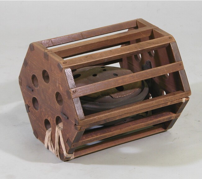 六角形の筒形の容器に鉄製の火容*(ひいれ)が取り付けられており、立てても、寝かせても、転がせても火容が水平を保つようになっている。