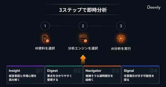Deemlyは、決算説明資料や適時開示などの一次情報をもとに、投資判断に必要な洞察をアナリストレポートとして生成・出力するAI分析エンジンです。ユーザーは無料の「Basicプラン」に登録し、IR資料と分析モードを選択するだけで、セルサイド・アナリスト出身者が監修した高度な「解釈のプロセス」を再現した分析視点を、意思決定に活用することができます。