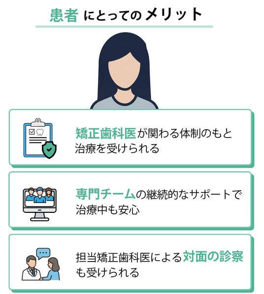 患者にとっては、提携クリニックにおいて矯正歯科医の関与のもと、専門チームによる継続的なモニタリングと、必要に応じた対面での対応を受けることができ、一定の基準に基づいた管理体制の中で治療に臨むことが可能となります。