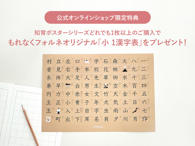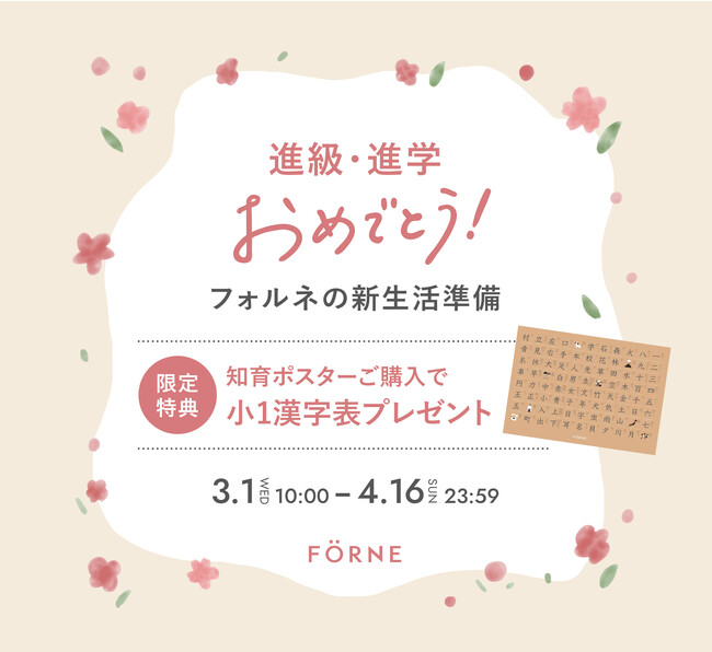 株式会社明朗社(所在地:愛媛県伊予郡、代表:権名津隆治)が展開する「FÖRNEフォルネ」では、2023年3月1日(水)から4月16日(日)まで『進級・進学おめでとう!フォルネの新生活準備』を開催いたします。新しいステージに進むお子さまへ「おめでとう」の気持ちを込めて、「小1漢字表」のノベルティをご用意いたしました。