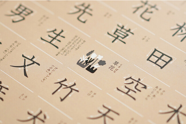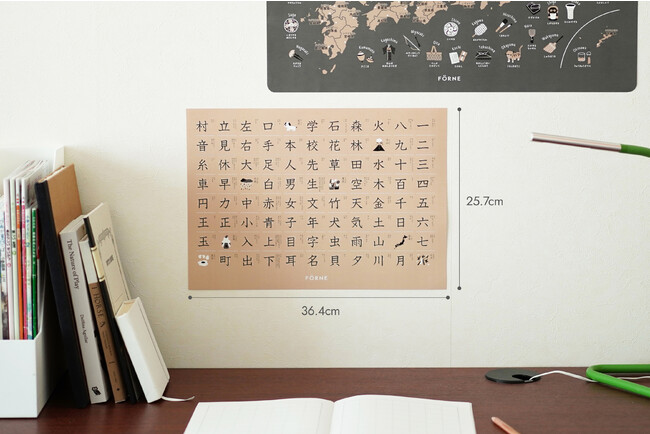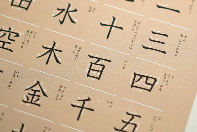 漢字の書体は、とめ・はね・はらいが分かりやすい楷書体です。カラーはフォルネの知育ポスターシリーズで人気のベージュ系。文字色はブラックで、視認性の高い配色に仕上げました。