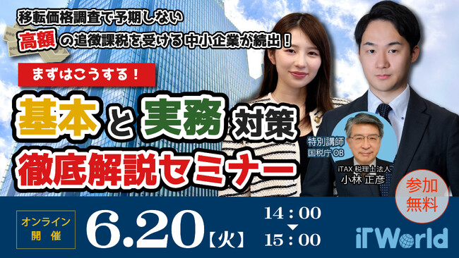株式会社IT World(本社:東京都港区、代表取締役:竹内徳史)は、海外拠点を持つ中小企業向けに、移転価格の基本や設定などに関するセミナーを開催します。