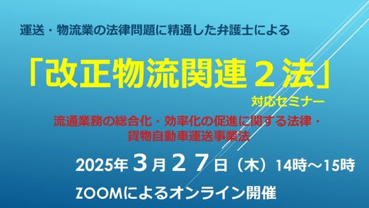 日時:2025年3月27日(木)14:00~15:00 ※申込〆切は3月26日(水)16時まで開催方法:Zoomによるオンライン開催※ZoomのURLについてはお申込みいただいたメールアドレスに送付いたします。※当日はセミナー開始15分前からアクセス可能です。受講料:無料<講座内容予定(一部)>・改正物流関連2法の趣旨・内容について