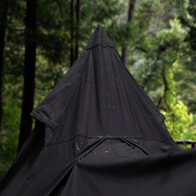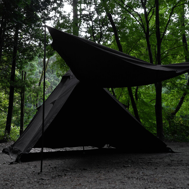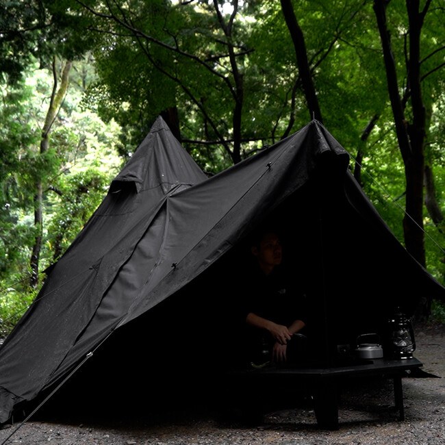 ブラックソロキャンプに最適なTC素材の黒いワンポールテント。