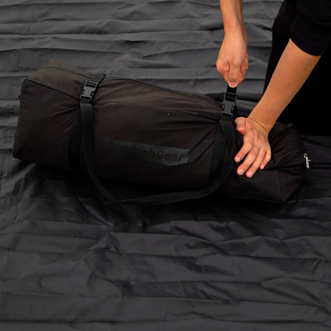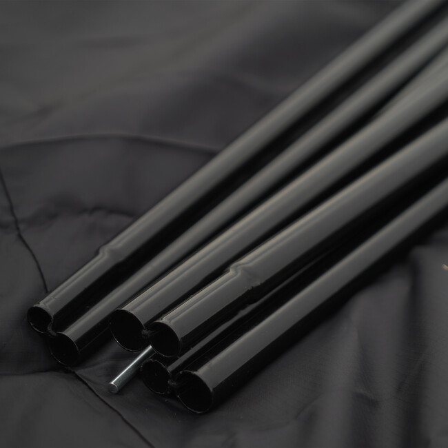 ポールはスチール製のメインポールとサブポールが1本ずつ付属。収納バッグはコンプレッション機能付きでよりコンパクトに持ち運べます。