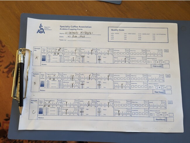 2023年産のニュークロップからナチュラル、ハニー、ウォッシュドなど5種類のコーヒー豆をカッピング。精製方法による違いに唸ってしまいました。ちなみにRoCoBeLが現在取り扱っているのはウォッシュド(水洗い式製法)のコーヒー。さすがに、それはすぐにわかりました。個人的にはナチュラル製法のコーヒーの味わいがとても印象的で、ちょっと高価ではありますが、ゆくゆくはこのコーヒーも取り扱いたいと思いました。