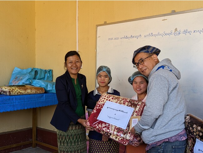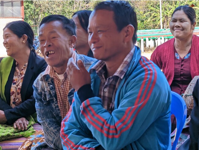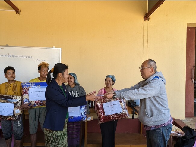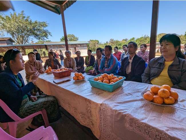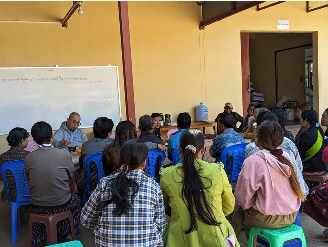 僕は傍で見学させてもらうつもりでしたが、「ここに座って!」とSu Su Aungさんに促され、彼女と並んで着座。冒頭で挨拶をさせていただきました。みなさんに「毎年素晴らしいコーヒー豆を日本に送っていただきありがとうございます」とお礼をお伝えし、ミャンマーコーヒーの里帰りをさせに日本からやってきたこと、RoCoBeLのつながるコーヒーの話、日本の障がい者施設で焙煎していることなどについて英語で説明、Su Su Aungさんがビルマ語に通訳してくれました。「自分たちの生産したコーヒーが日本の障がい者施設の役に立っている」そのことにみなさん、感動し、喜んでくれたようです。クーデターの最中で、ちょっと怖かったけど、ユワンガンまできて、良かったと思いました。