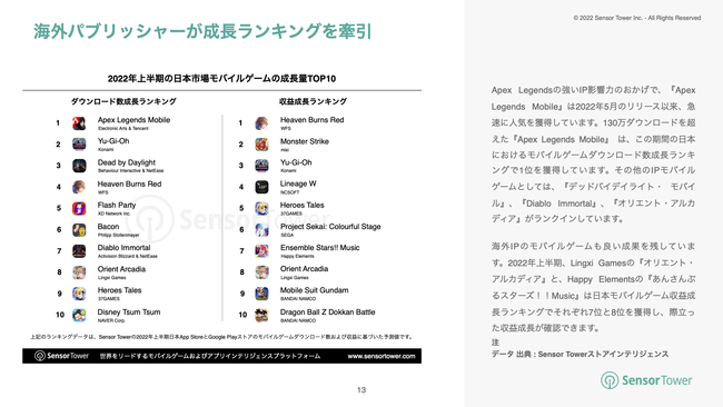 2022年上半期、日本では『Apex Legends Mobile』を始め、多くのIPモバイルゲームが突出した成長を遂げました。TencentのLIGHTSPEED STUDIOSとEAが共同開発し、PCで膨大なユーザーベースを持つ同作は、日本でのダウンロード数の伸びで1位を獲得しました。