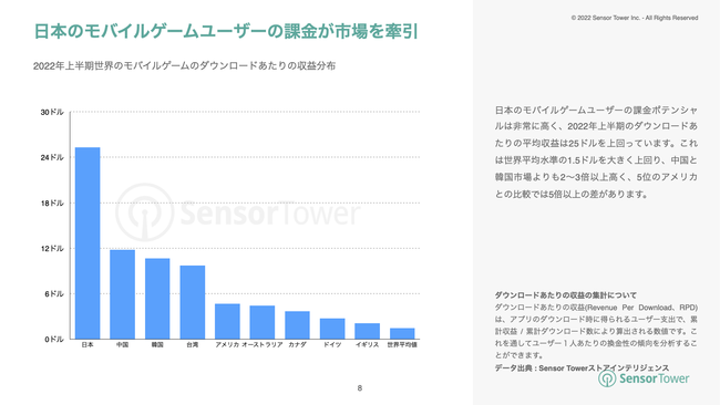 日本のモバイルゲームはダウンロード数において明確な優位性を示すことがなくても、非常に高い課金ポテンシャルを秘めています。 2022年上半期の日本のダウンロードあたり平均収入額は25ドルを超え、アメリカ市場の5倍に達しました。
