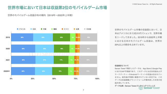 世界におけるモバイルゲームの収益シェア率をみると、日本は長らく世界市場をリードしており、アメリカに次ぐ世界2位を獲得しています。2019年から2022年上半期にかけて日本のモバイルゲーム収益は、世界で毎年20%以上の割合を占めています。