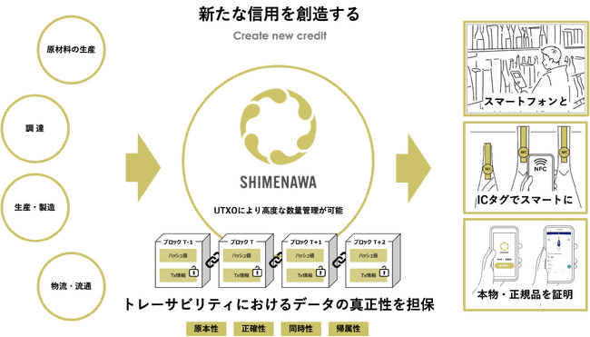 SHIMENAWAは世界で350社を超える金融機関、規制当局、中央銀行、システムベンダなどにより構成されたコンソーシアムで企業間取引を想定して設計・実装されたブロックチェーン基盤のCorda(コルダ)を採用し、NFC/RFID技術とのデジタルペアリングなどで共有される情報の真正性を担保するシステムで、信頼性の高いエンド・ツー・エンドのトレーサビリティを実現します。
