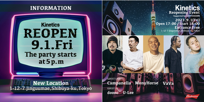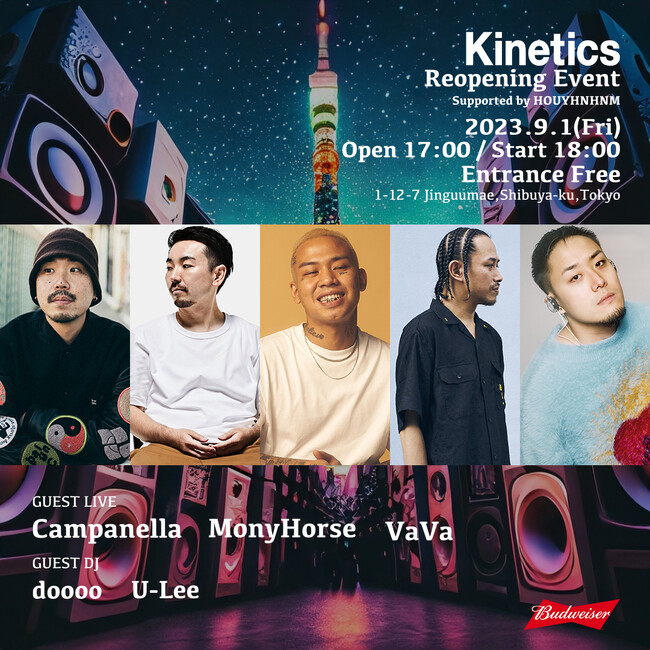 また、当日の18:00~はCampanella/MoneyHorse/VaVaによるライブパフォーマンスに加え、doooo/U-LeeのDJパフォーマンスを行い、現代の音楽カルチャーを牽引する豪華出演陣がKinetics新店舗オープンのお祝いを彩ります。