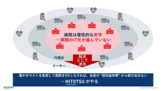 一方、業界全体でDXが遅れている要因として、医療提供体制のキーステークホルダーである「病院」が慢性的な赤字であり、IT化に投資する体力が十分ないことが挙げられます。誰かがコストを負担して病院をDXしなければ、代理店やメーカーを含む全員が低利益体質から抜け出せないと考え、HITOTSUは医療機関のHITOTSU Link利用料を負担しています。HITOTSU Linkを医療機関に無償で提供しているのはこのためです。代理店やメーカーなどの医療関連企業には、営業生産性向上の対価として、接続先医療機関様の病床数に応じた費用をいただくビジネスモデルとしています(一定条件で接続料が無償となるパートナーシップ応援制度あり、詳細は企業向けリーフレットをご覧ください)。