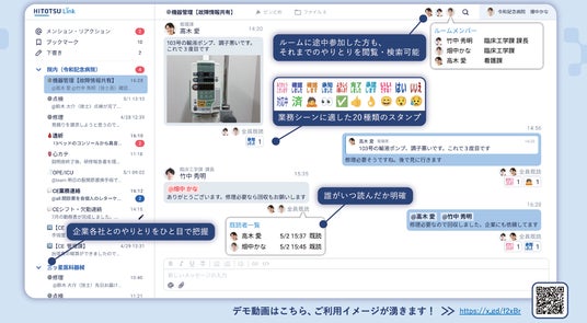 医療業界特化型チャットツールHITOTSU Linkの画面イメージ。院内だけでなく、接続した企業や他病院ともやり取り可能であるのが最大の特長。 トピックごとの「ルーム」を作成し、招待されたメンバーのみで議論やプロジェクト管理、ナレッジ共有が行える。PDF・Word・画像・動画など各種ファイルの添付も可能。業務シーンに適した20種類のスタンプで手軽に反応できるほか、誰がいつ読んだかがひと目で分かる。