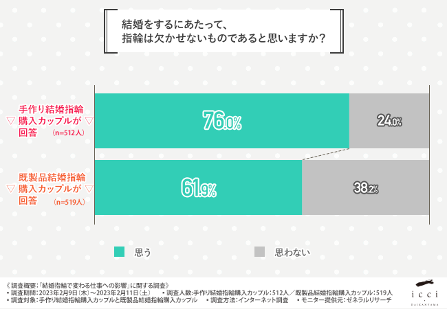 この調査では、手作り結婚指輪を購入したカップルのほうが、結婚をするにあたり指輪は欠かせないと感じている方の割合が高く(「思わない」と回答した方の割合が低く)なりました。