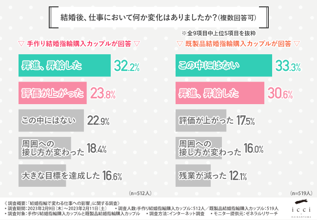 そこで、代官山の手作り結婚指輪・婚約指輪専門店「icci 代官山」(https://www.1-daikanyama.jp/)を運営する株式会社一は、手作り結婚指輪を購入したカップルと既製品結婚指輪を購入したカップルを対象に、「結婚指輪で変わる仕事への影響」に関する調査を実施しました。
