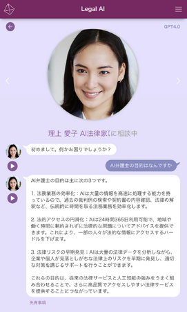 さらに法的な助言が必要な場合は、本物の弁護士や士業資格者が対応する仕組みとなっており、弁護士及び士業資格者が自身の法律業務の補助的に使用するツールです。