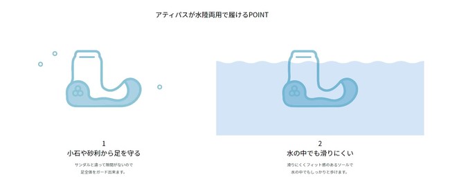 さらにグリップの効いたソールがあるので素足よりも水の中で動きやすくなります。普段のお散歩から夏のプールや海へのお出かけまで。アティパスには水陸両用で履けるポイントが詰まっています。
