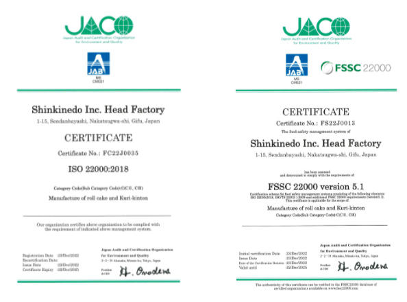 株式会社新杵堂(代表取締役社長 田口美保子、以下「新杵堂」という)は(※1)、世界的な安全認証FSSC22000認証を2022年12月23日に取得いたしました。(※2)