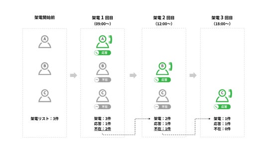 本機能の開発により、一度に複数回の架電時間を設定できるようになります。さらに再架電設定をONにすると、2回目、3回目の架電実行時に、その時点で電話がつながっていない求職者を自動で判定し、該当の求職者に対して架電が行われます。(※その時点で電話がつながっている求職者は除いて架電を行います。)