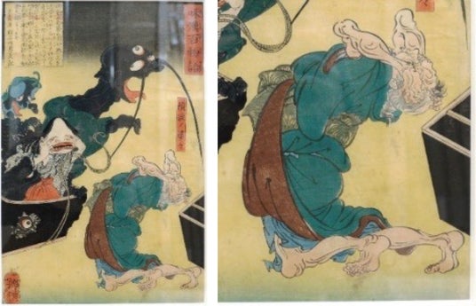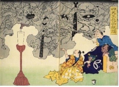 「四天王化物蝋燭(してんのうばけものろうそく)」慶応4(1868)年 大判錦絵2枚続