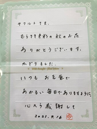 「今年もありがとう~もう1年たつんですね」などお話ししながら、お客様の変わらぬ笑顔、変わらぬ日常に安堵しつつ、敬老の良き日を迎えることを一緒に喜び合っています。