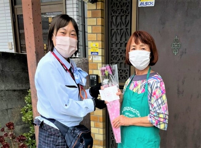 「愛の訪問活動」とは、ヤクルトレディが商品をお届けしながら、一人暮らしの高齢者の安否を確認することや、お話し相手になることを目的とした社会貢献活動です。この活動は、1972年に福島県郡山市のヤクルトレディが自分の担当する地域の中で、一人暮らしの高齢者が誰にも看取られずに亡くなったことに心を痛め、一人暮らしの高齢者に自費で「ヤクルト」を届けるという自発的な活動から始まりました。この活動に販売会社および民生委員が共鳴し、さらには自治体をも動かし、全国に活動の輪が広がっていきました。 「敬老の日お花プレゼント」は、「愛の訪問活動」の一環で始まり、全国で「愛の訪問活動」を行う自治体と連携し、75歳以上の一人暮らしの高齢者へ、カーネーションとメッセージカードをお手渡しでお届けしています。