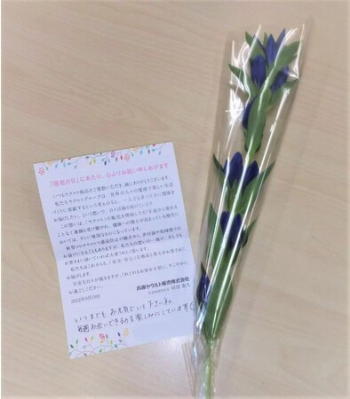 兵庫ヤクルトの販売エリアでは、明石市が「愛の訪問活動」を行う自治体となりますが、エリア内の全地域へ活動の輪を広げたい想いから、明石市以外の市町村においては、2014年度より、敬老の日に合わせて、りんどうの花とメッセージカードをお届けしています。例年大変喜ばれていることから「これからも元気で過ごしていただきたい」という思いを込めて、本年も当活動を継続して行います。