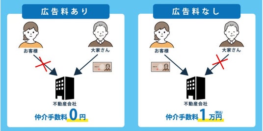 「ぜろいちくん」では、大家さんから広告料が支払われる物件は仲介手数料0円とし、それ以外の物件では1万円をいただく仕組みになっています。1万円は、内見や契約の手続きなどで発生する、最低限の仕事に対する報酬分です。そのため「ぜろいちくん」では、仲介手数料0円か1万円で賃貸物件のご紹介が実現できます。