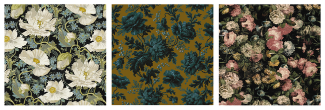 オランダの巨匠からインスピレーションを得たMIDNIGHT GARDENは、日没後のカントリーガーデンを描いたもの。ピンク、グリーン、オフホワイト、ブルーのクラシックなカラーパレットに咲き誇る花々が描かれ、伝統的な花柄をより薄暗くロマンティックに仕上げています。