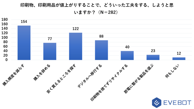 それを受けた節約意向が高い282人に対して「印刷物、印刷用品が値上がりすることで、どういった工夫をする、しようと思いますか?」と質問したところ、1位は「購入頻度を減らす」で56.4%(154人)、2位は「安く買えるところを探す」で43.3%(122人)、3位は「デジタルへ移行する」で31.2%(88人)、4位は「購入を辞める」で27.3%(77人)という結果となりました。当然の結果ではあるものの、印刷物、印刷用品の節約として「購入頻度を減らす」が5割、「安く買えるところを探す」が4割を超えており、消費者は、出来るだけ長く使おうと意識し、買い替えるときは、安い製品を探す傾向が伺えます。