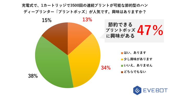 そんな中で、EVEBOT JAPANが販売するハンディープリンター「PrintPods(プリントポッズ)」は、充電式で1000回の連続プリント、1カートリッジで3500回の連続プリントが可能な小型のプリンターです。小さなものや名入れが必要な物に印刷でき、持ち運びができるのが特徴で、昨今の印刷費用高騰の影響やアフターコロナでイベントが多く開催されるようになった背景から、現場で簡単に無駄なく印刷できる「PrintPods(プリントポッズ)」が人気です。「ハンディープリンター「プリントポッズ」が人気です。興味はありますか?」と質問したところ、「興味がある」と回答したのは13.3%(80人)、「少し興味がある」と回答したのが33.8%(203人)、「いいえ、ありません」と回答したのが38.0%(228人)、「どちらでもない」と回答したのが14.8%(89人)という結果となりました。4割を超える半数近くが「興味がある」と回答しており、多様化するニーズに合わせながら「節約志向」のプリンター需要は今後も増えていくと予想されます。