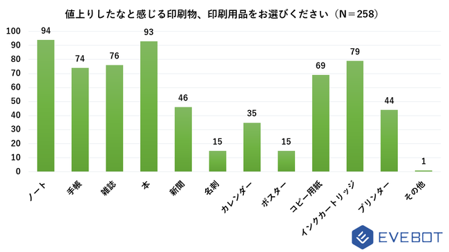 物価高の傾向は続き、印刷業界でも昨年度から値上がりの傾向が続くようです。「値上りしたなと感じる印刷物、印刷用品をお選びください(複数回答可)」と質問したところ、「分からない」と回答した人を除く、値上がりを実感する257人の中で1位が「ノート」で36.4%(94人)、2位が「本」で36.0%(93人)、3位が「インクカートリッジ」で30.6%(79人)、4位が「雑誌」で29.5%(76人)という結果となりました。新学期、新生活が始まる時期もあってか、生活必需品でもある「ノート」が1位となり、印刷物の値上げも身近なものになっていると考えられます。3位に「インクカートリッジ」がランクインしており、印刷物だけでなく印刷用品にもその影響は及んでいそうです。