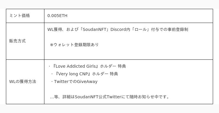 厳しい暗号資産(仮想通貨)市況を受けて、リリースはETHチェーンでの販売となりましたが、日頃コミュニティを支えてくれる方々や今回のリリースにご期待いただいた方々への感謝を込めて、0.005ETHという手に取りやすい価格での販売を行います。これはコミュニティを支えてくださった方々への感謝であると共に、Web3の哲学とも言える「プロジェクトの価値をコミュニティと分かち合い共に成長していく」というSoudanNFTの気持ちを表現したものです。