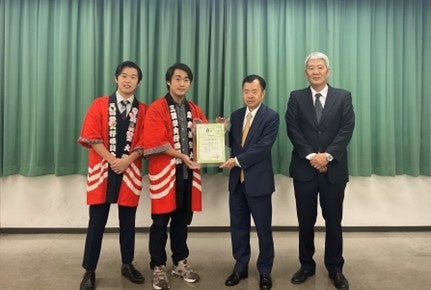 (左から)第66回三田祭実行委員会 山下様・武田委員長様、田邊工業(株) 田邊社長様 アストモスエネルギー(株) 岩丸理事関東支店長