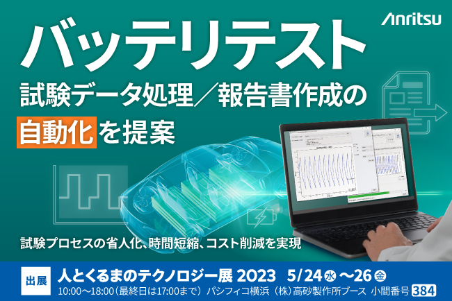 アンリツ株式会社(社長 濱田 宏一)は、BEV[※1]用バッテリの試験データを自動的にユーザ指定のフォーマットに再構成し、テストレポートを作成するソリューションを株式会社高砂製作所のブースにてご紹介します。