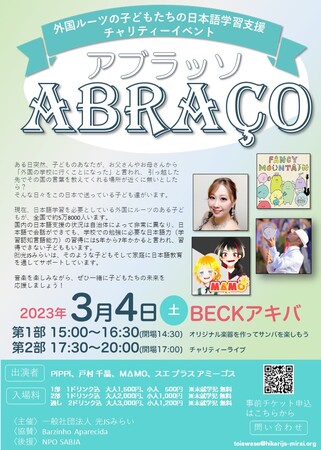 一般社団法人 光JSみらい(本部:東京都大田区、代表 梅本 祥子、URL:https://hikarijs-mirai.org/)は、外国につながりのある子どもたちの日本語学習を支援するためのチャリティーイベント『アブラッソ』を、3月4日(土)BECKアキバにて開催いたします。