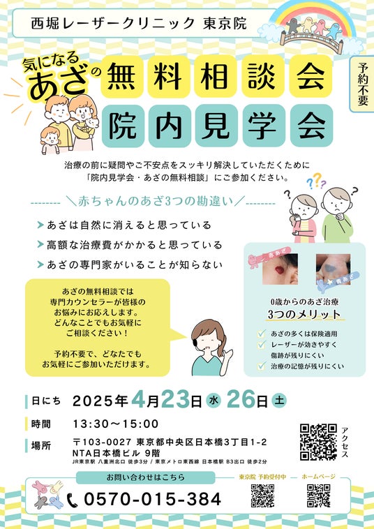 開院に先立ち、2025年4月23日(水)・4月26日(土)に「あざの無料相談会・院内見学会」を西堀レーザークリニック 東京院にて開催いたします。治療の前に疑問やご不安点をスッキリ解決していただくためにご活用ください。あざの無料相談では専門カウンセラーが皆様のお悩みにお応えします。