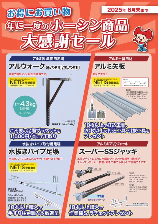 建設業界においては、依然として資材価格の高騰が課題となっております。株式会社ホーシンでは、このような状況下でもお客様の事業活動を少しでもサポートしたいという想いから、年に一度の大感謝セールを実施することといたしました。また、近年お問い合わせが増加している補修・補強関連工事をはじめ、多様化する現場のニーズにお応えすべく、関連性の高い製品をお得にご提供いたします。この機会をぜひご活用いただき、コスト削減や生産性向上にお役立ていただければ幸いです。