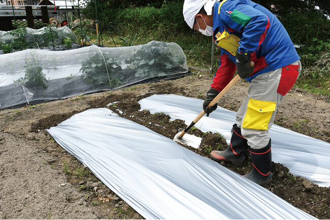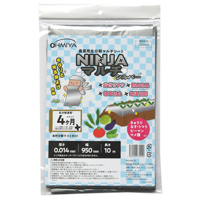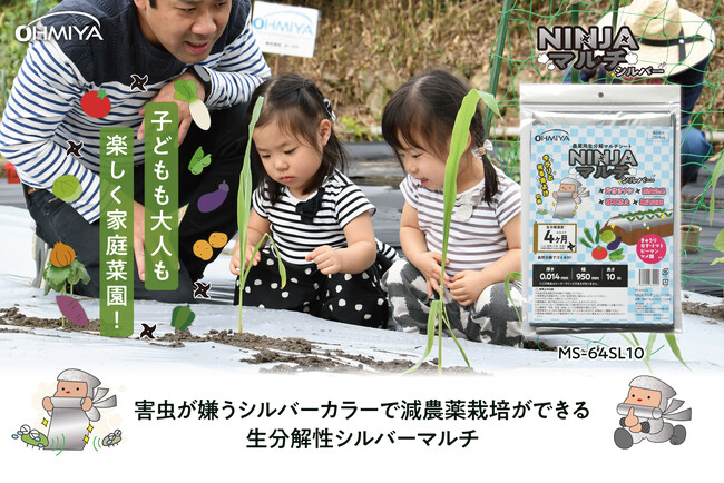 『NINJAマルチシルバー MS-64SL10』は、長さ10mの使い切りタイプで、家庭菜園に最適な長さとなっています。近年関心が高まっているオーガニックや減農薬栽培をチャレンジする方に使いやすい長さです。作物収穫後にはシートを鍬で土中にすき込むことで自然分解するため、プラごみの削減も繋がります。家族で減農薬で野菜を育てながら、子供と一緒に環境問題を考えるきっかけになることを期待しています。