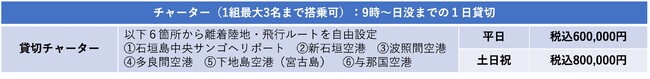チャーターフライトは、東は宮古・下地島空港から西は与那国空港までの間に位置する6ヶ所に離着陸可能で、飛行機やフェリーの時間にとらわれない、乗り放題のプランです。