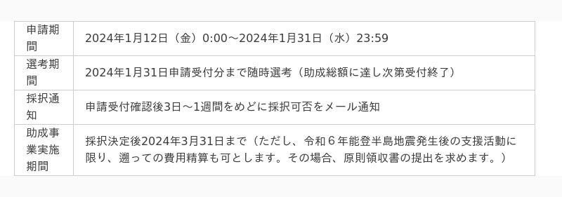 この基金では石川県内での緊急・復旧・復興支援活動を助成プログラムで支援します。緊急期のみならず、復旧期・復興期まで中長期的な支援を行う予定です。2024年1月31日(水)まで公募を受け付けています。※助成総額に達し次第受付終了