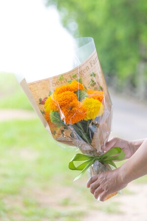 土日祝日限定で、園内のマリーゴールドを一株まるまる摘み取ってお持ち帰りいただくことができます。