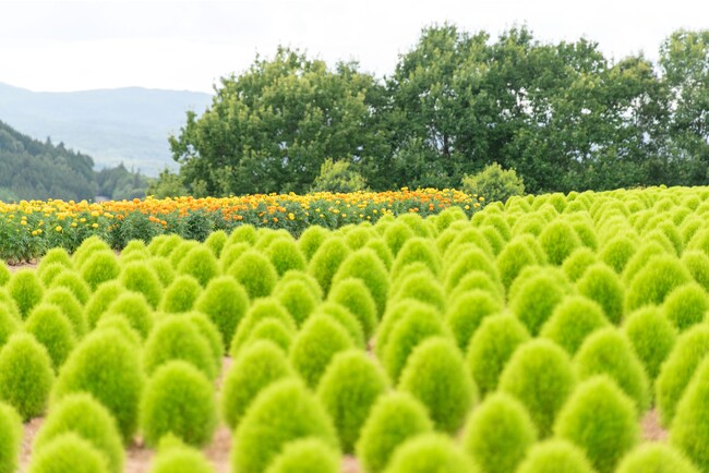 2,000株のコキアが丘一面に広がります。夏色の花々にコキアの爽やかなライムグリーンが加わることで一層引き立ちます。