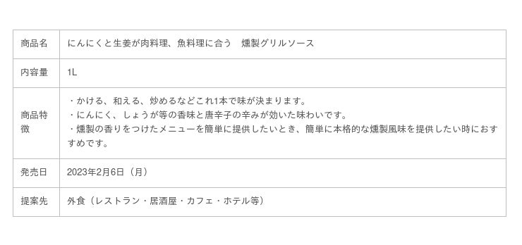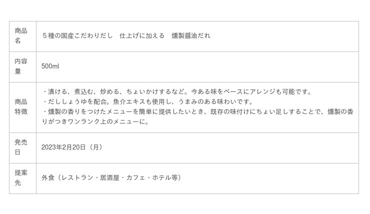 総合食品メーカーのヤマモリ株式会社 (本社:三重県桑名市、代表取締役社長:三林圭介) は、全国の業務用販路(外食・中食)向け、「にんにくと生姜が肉料理、魚料理に合う燻製グリルソース」を2月6日(月)、「5種の国産こだわりだし 仕上げに加える燻製醤油だれ」を2月20日(月)より発売いたします。